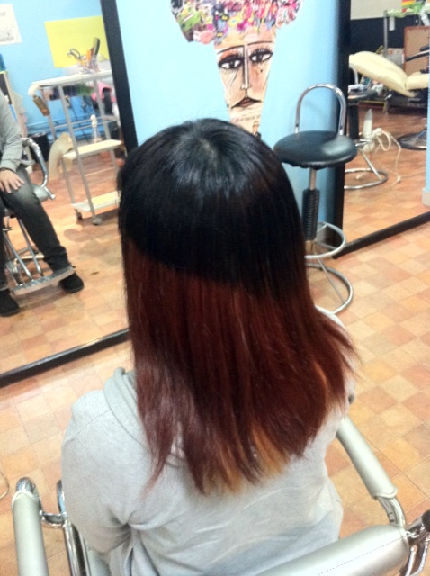 シンガーのまあさ様の髪の毛をナナメに上黒!下ワインレッドで、内側の半分を金でカラーしました!